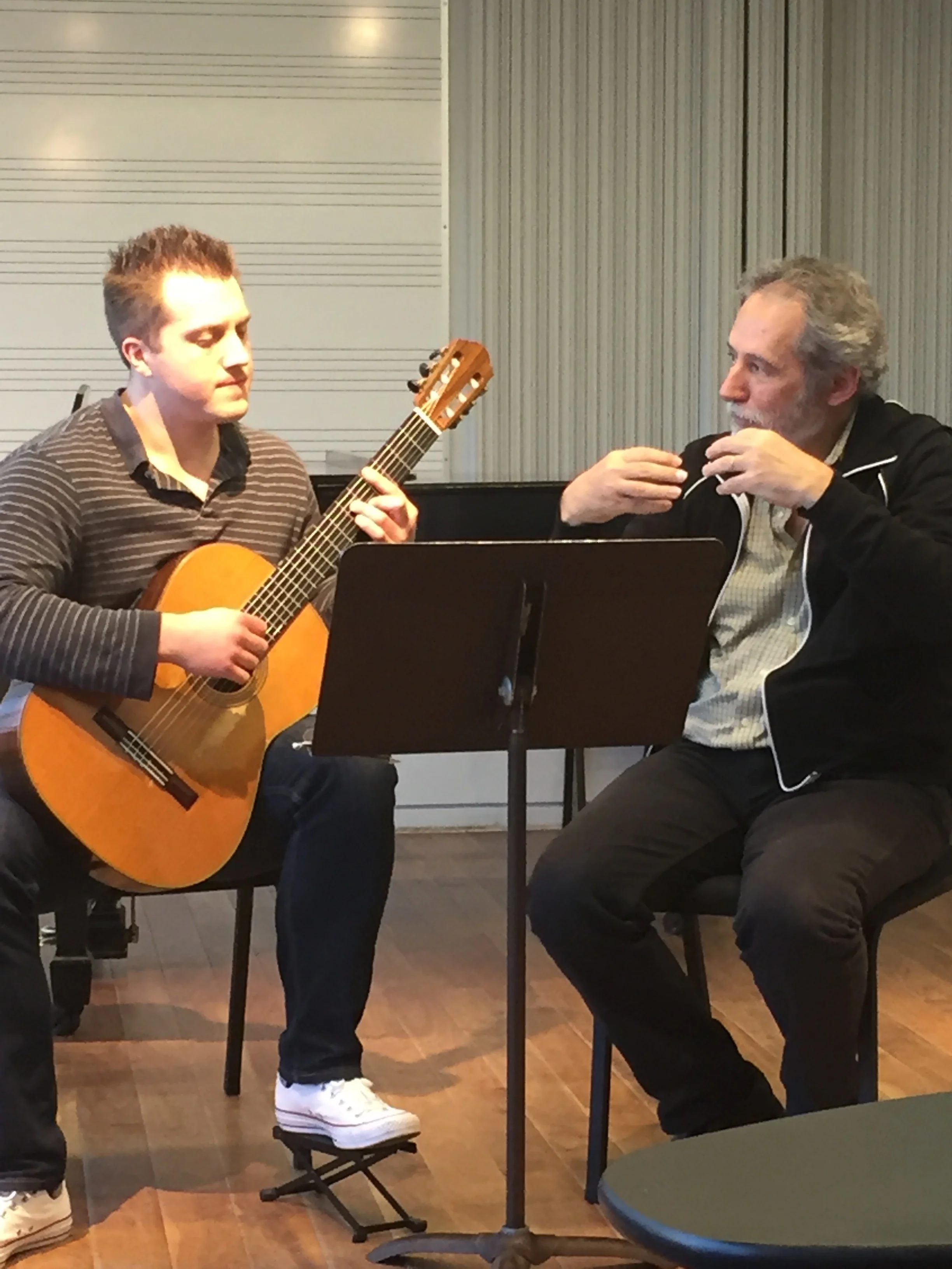 Sergio came (without Odair), and gave coachings to the three current PI Ensembles, each which had prepared one of Sergio's pieces. They'd received the scores a couple of weeks ahead, and had made arrangements as best suited their respective groups. Then they used the material as a springboard for improvisation. In the guitar area, he gave a master class dedicated either to teaching his own works, or pieces indelibly associated with the Assad Duo. He also gave several guitar students private lessons. Delightfully, during the master class, he played a solo, accompanied by Jamey-- a piece of Sergio's they later presented in the final concert.