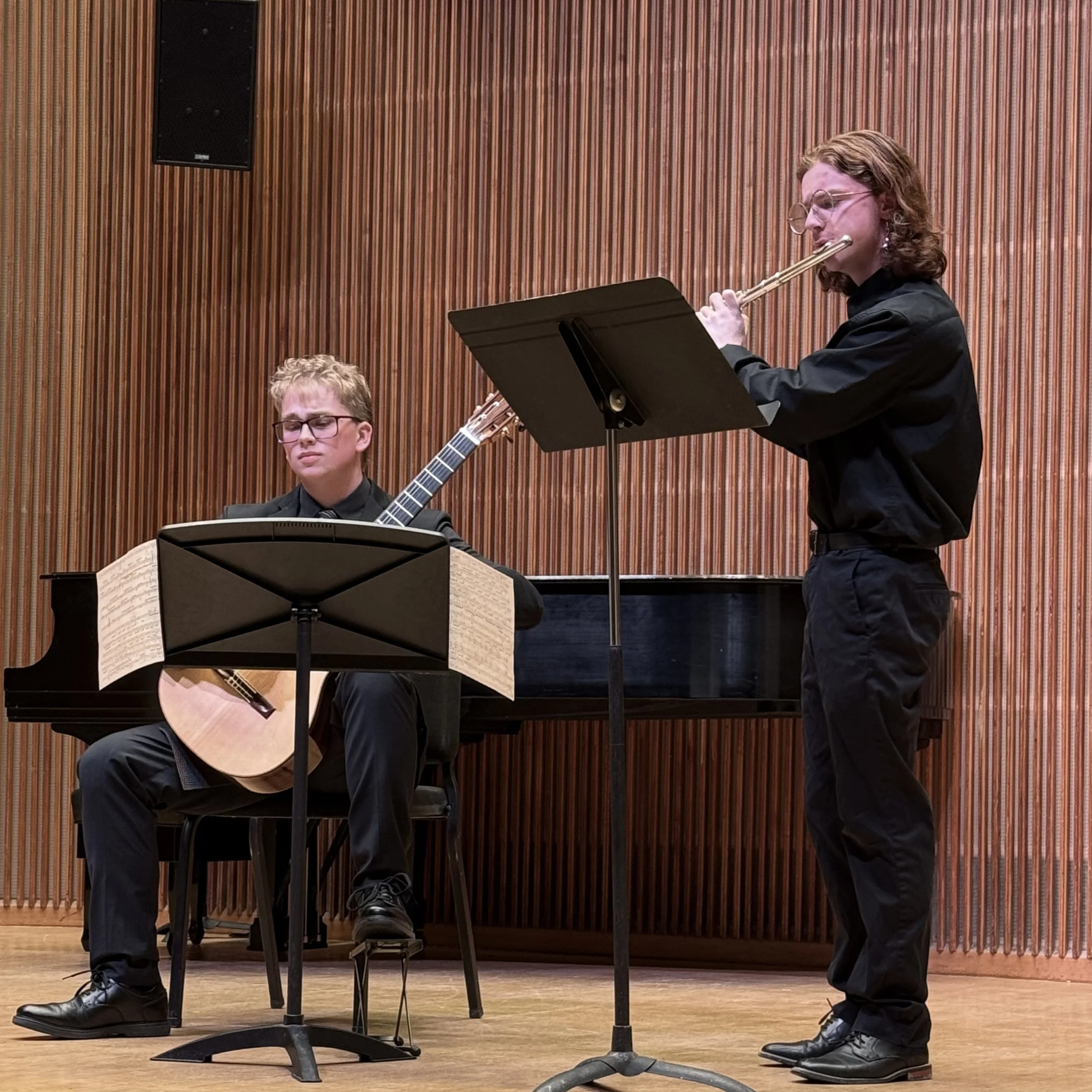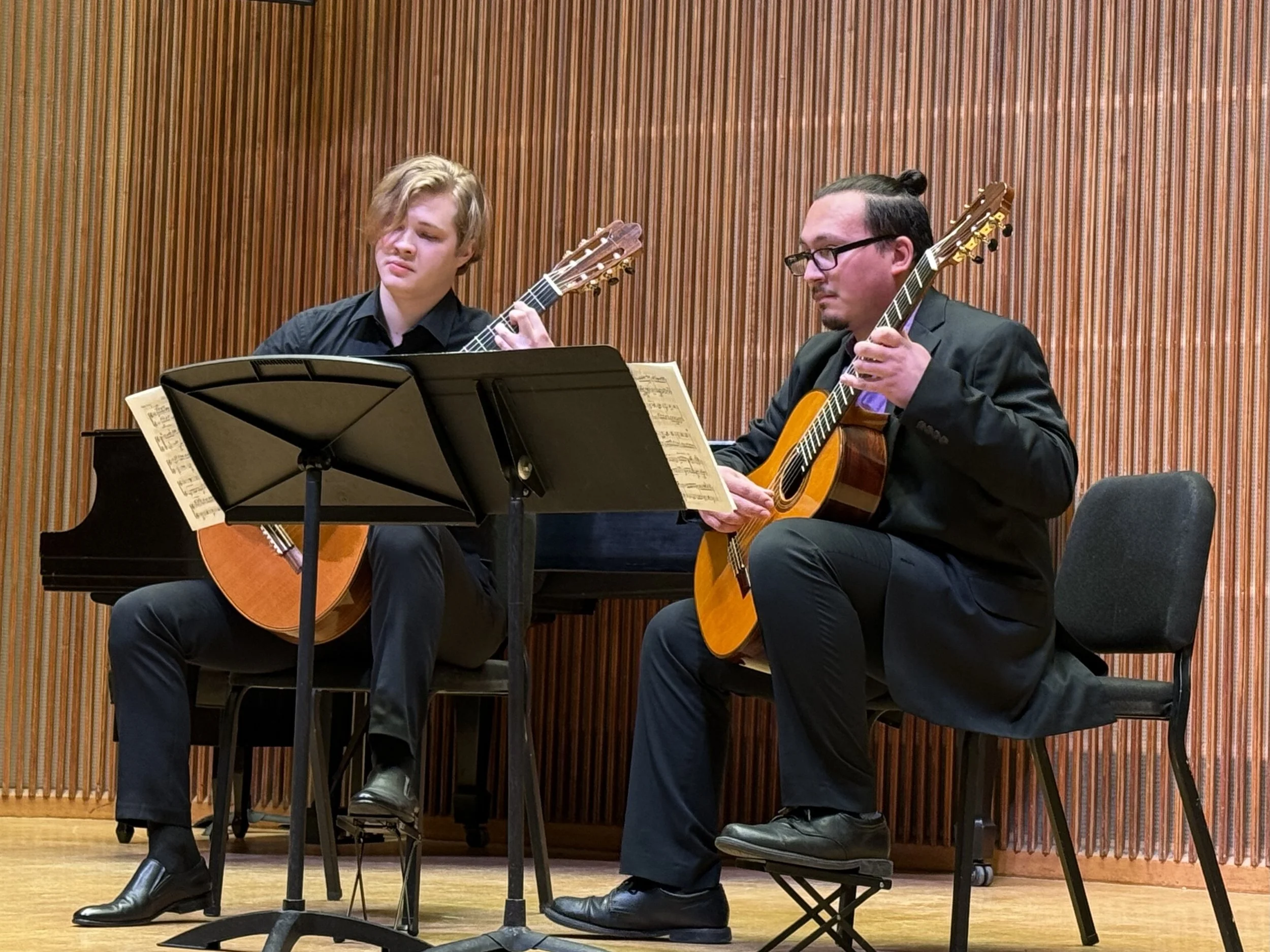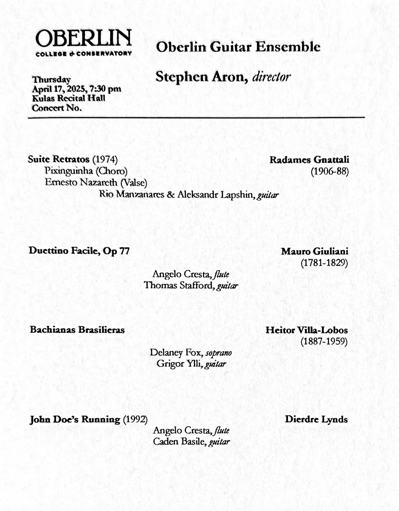 We had our annual spring chamber music performance this week. While the performances fulfill the requirements of the class “Guitar Ensemble”, what we play is mostly mixed chamber music. (I go into some detail on why I do it this way here.) Commonly, our Fall Semester features two concerts, with each student playing two or more pieces while in the spring we put on a single show. In this way, I can defer some to the student’s need to prepare their solo recitals at the same time. In spite of my general lean toward mixed chamber music, this program included two guitar duets. (The full program is included at the end of the post). The first item on the program was one of these: a couple of movements from the great Brazilian work, Suite Retratos, by Radames Gnattali. It was played exuberantly by Rio Manzanares and Aleksandr Lapshin.