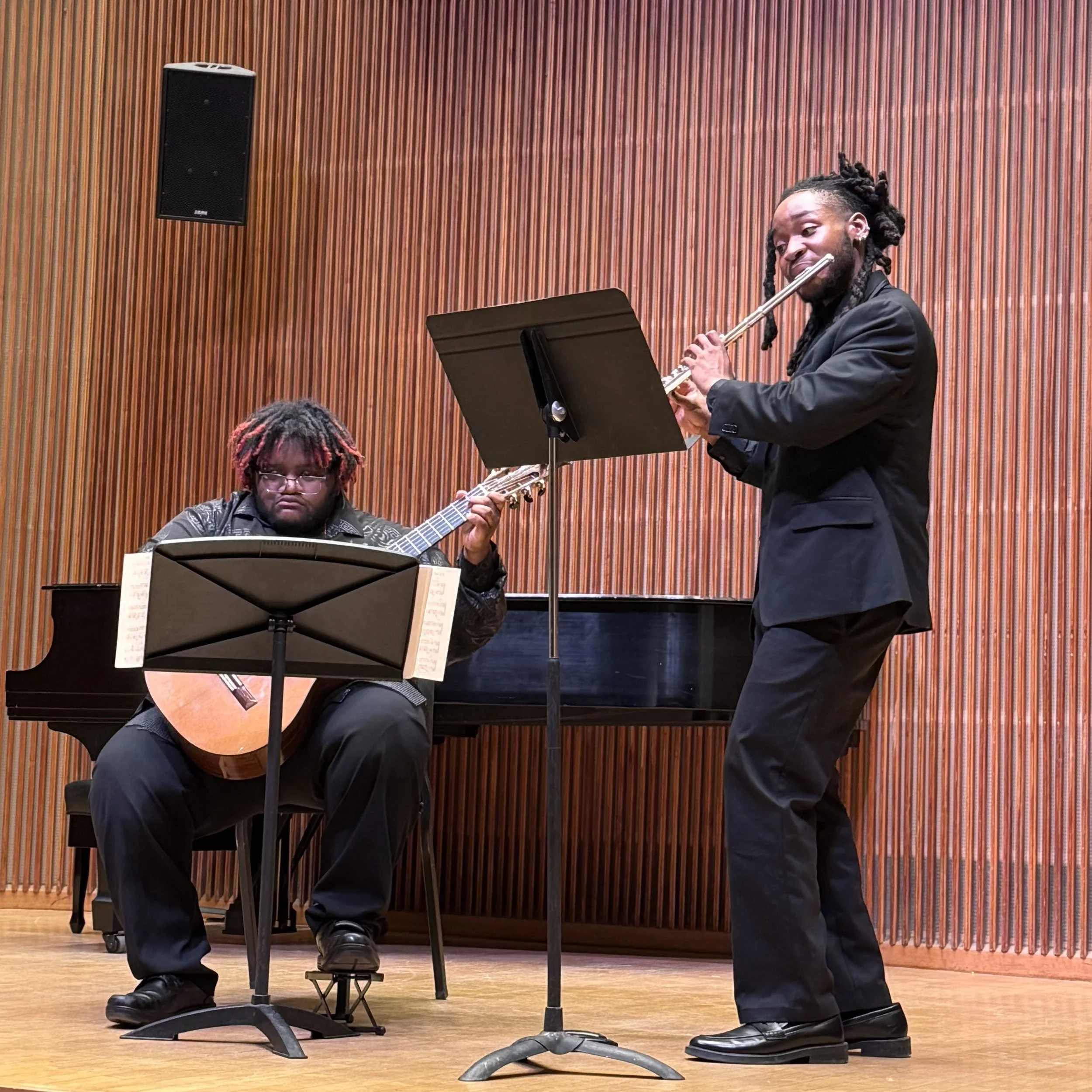 For our next work, flutist Angelo Cresta returned to the stage, this time with guitarist Caden Basile. They presented the contemporary favorite, John Doe’s Running, by Dierdre Lynds. They played with impressive clarity and rhythmic verve, with Caden holding down the various grooves easily, and Angelo sounding like an improvising jazzer in his element. The large crowd responded loudly.
