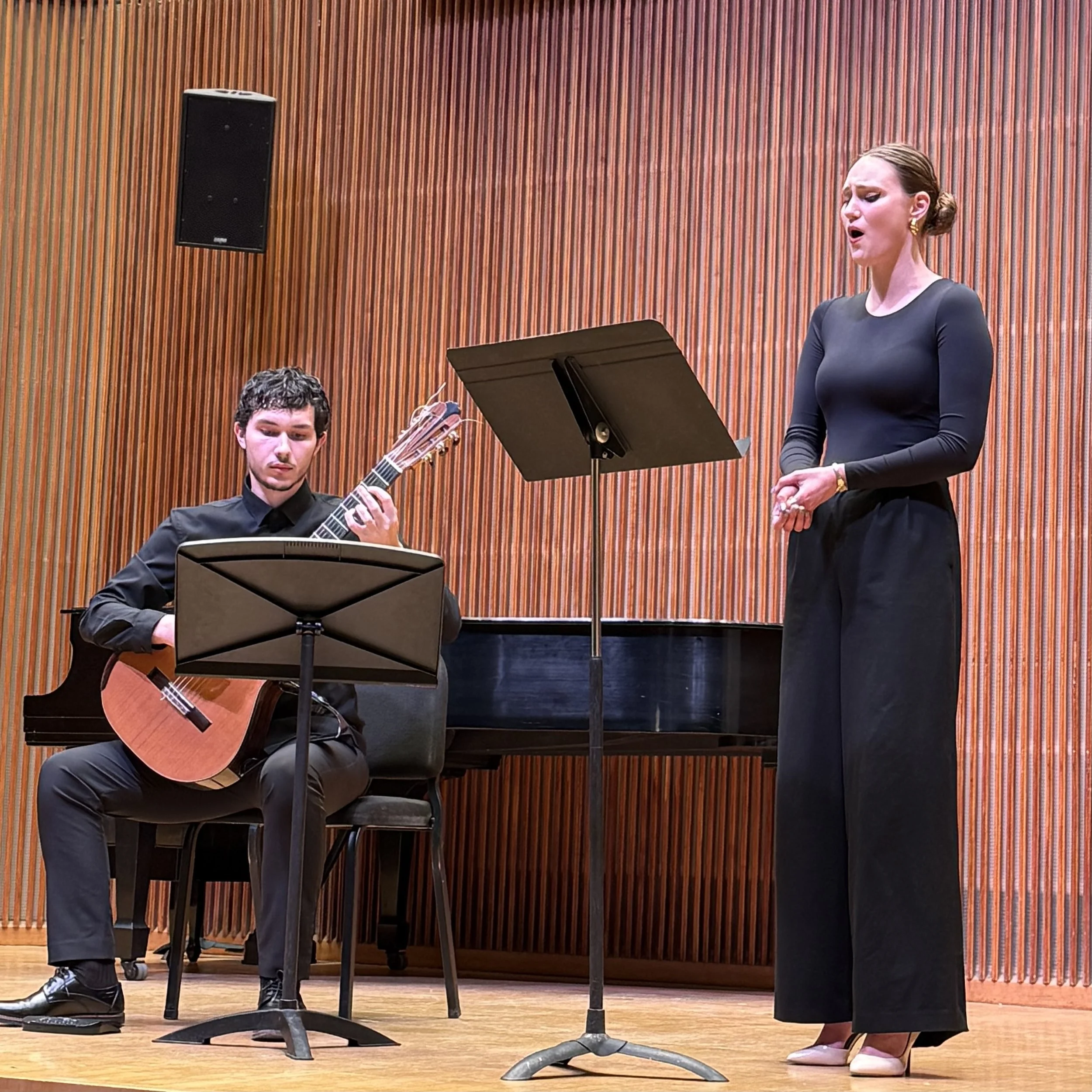 Next up was the beloved Villa-Lobos song, Bachianas Brasilieras. Soprano Delaney Fox delivered this richly expressive score expertly—she even managed the difficult humming section at the end with elegance and impressive control. Her guitarist, Grigor Ylli, supported her musical phrases and dynamic shapes admirably.