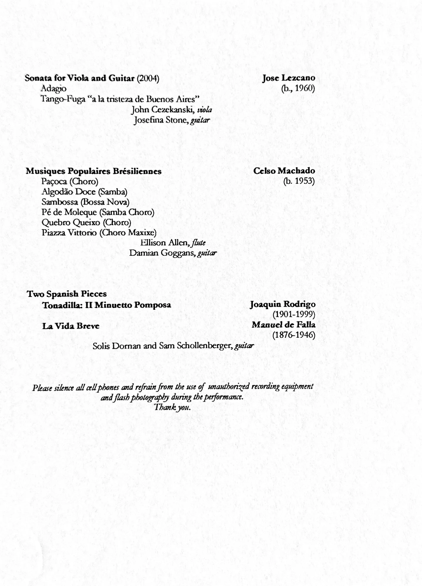 Our next piece was the wonderful Sonata for Viola and Guitar by Jose Lezcano. Violist John Cezekanski was assisted by Josefina Stone for this outing. They played the sultry second movement and the complex tango that concludes the work, and landed them both with a delightful insouciance. The audience love it.