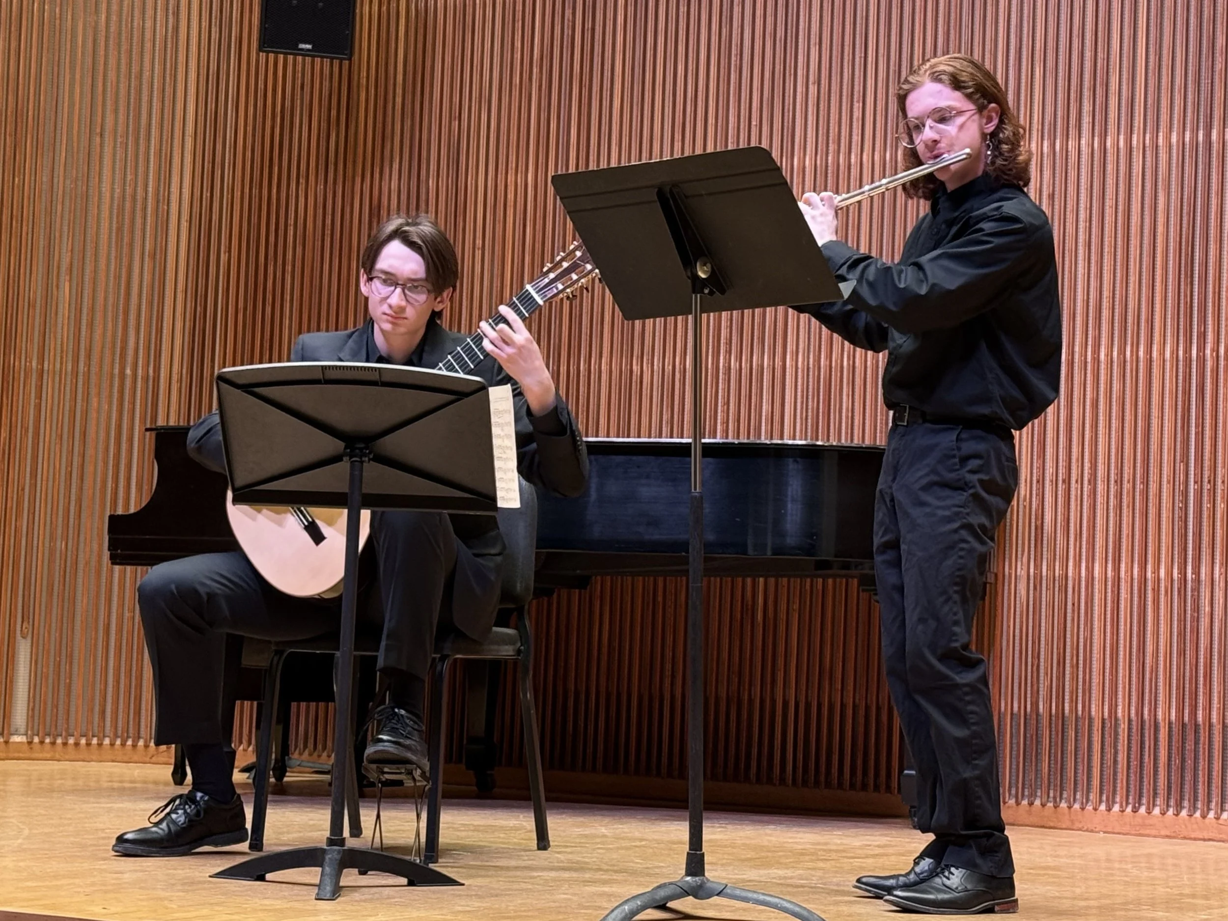 Our final piece of the evening was a set of two Spanish pieces, as played by guitarists Solis Dornan and Sam Schollenberger. First was the middle movement of the Tonadilla by Joaquin Rodrigo. This was followed by La Vida Breve by Manuel de Falla. Sam and Solis had rehearsed deeply and on stage played the pieces with impressive clarity, ensemble detail, musical perspicacity and, when required, virtuosic flair. When they finished, the audience erupted enthusiastically.
