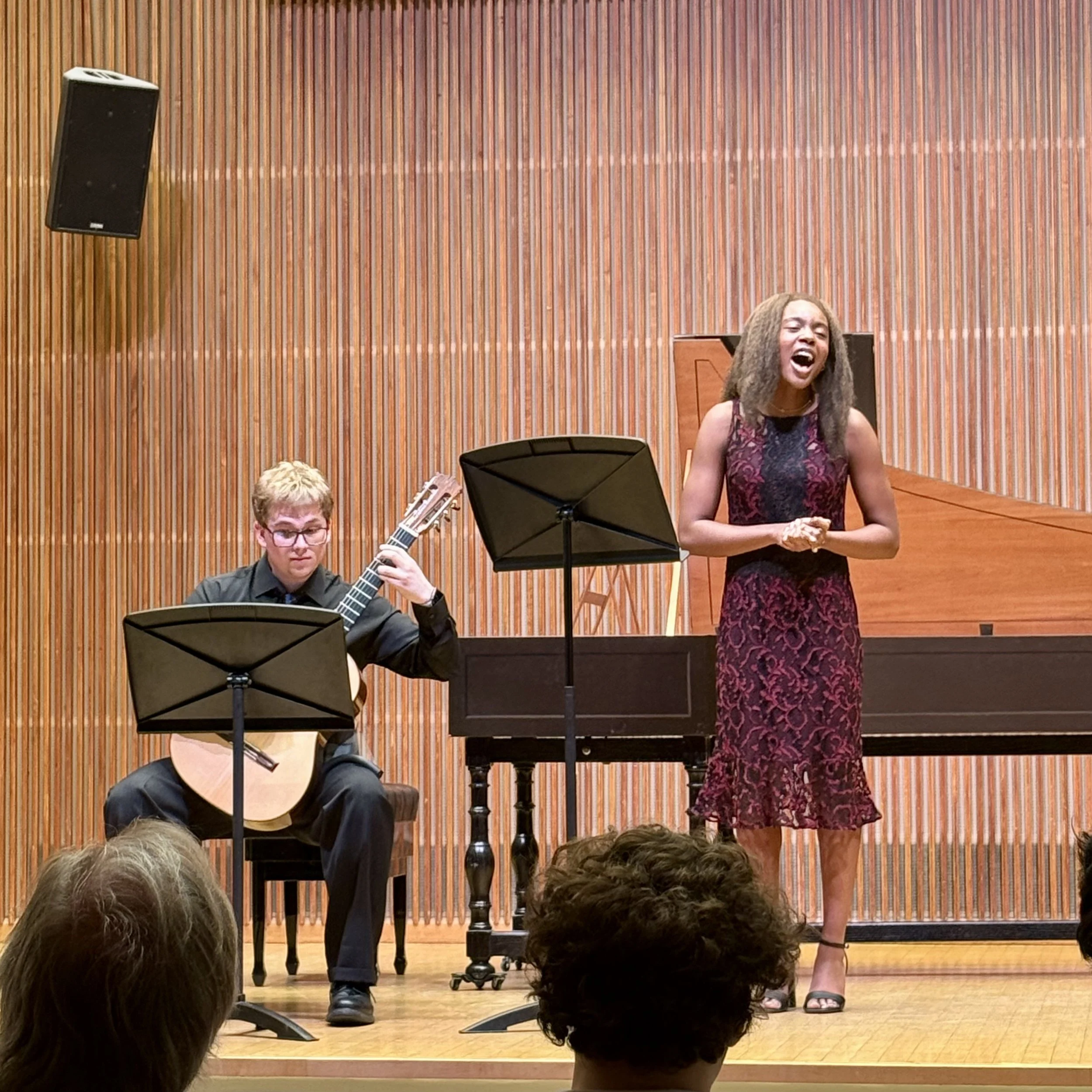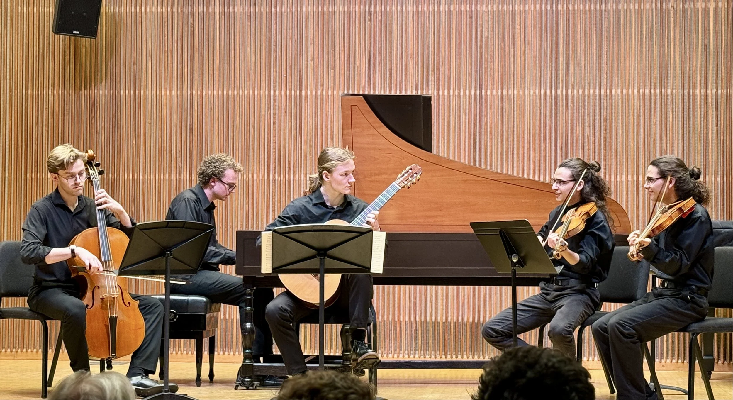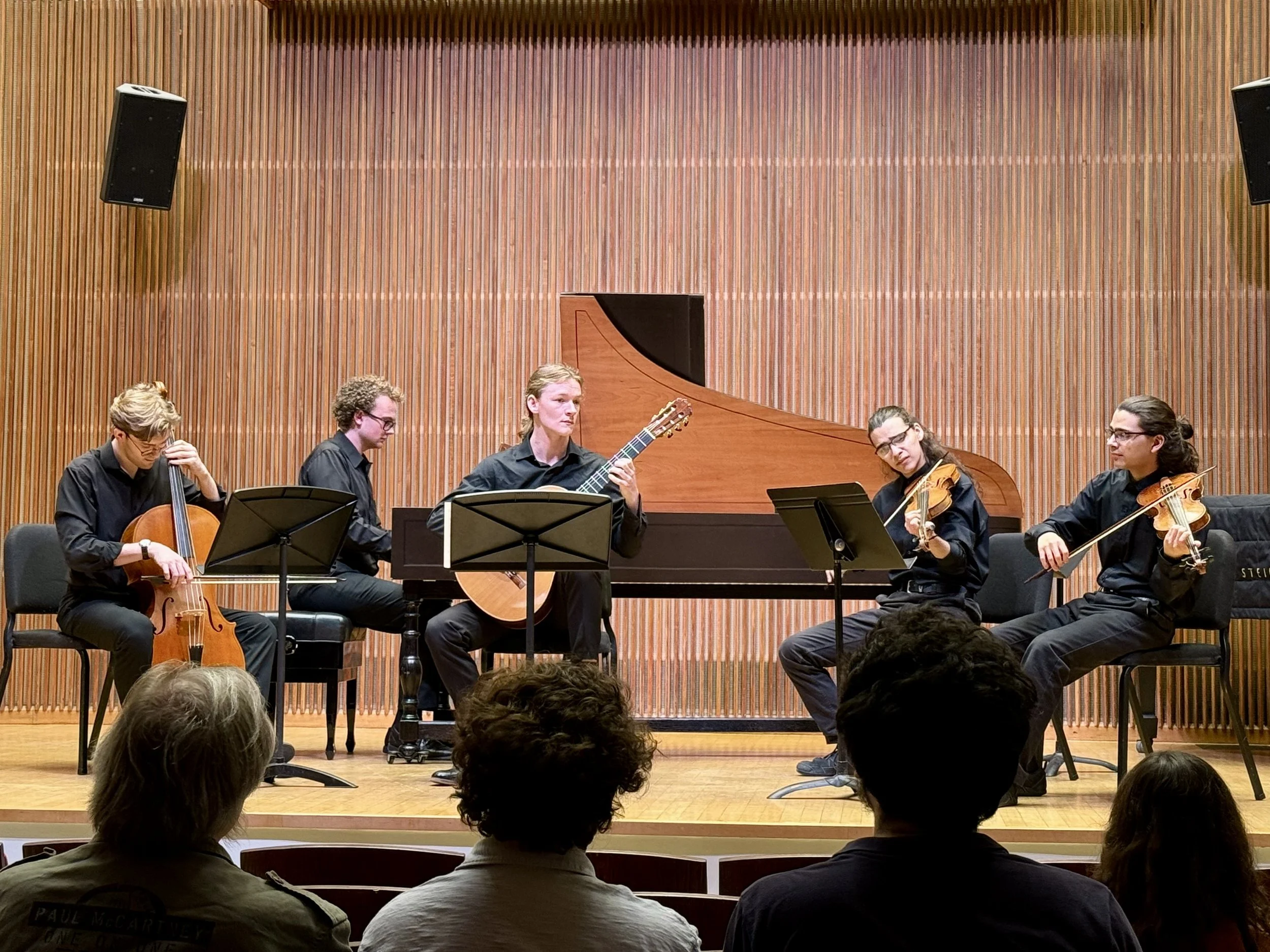 Next up was a reading of Vivaldi’s beloved Lute Concert in D, performed on guitar by Sam Schollenberger, and accompanied by members of the Historical Performance division: violinists Boaz and Aaron Mechim, cellist Zack Price, and harpsichordist Lucas Peters. While the ensemble had scant time to rehearse this work in advance, it nonetheless sounded highly professional and intensely spirited. The audience erupted with hoots afterwards.