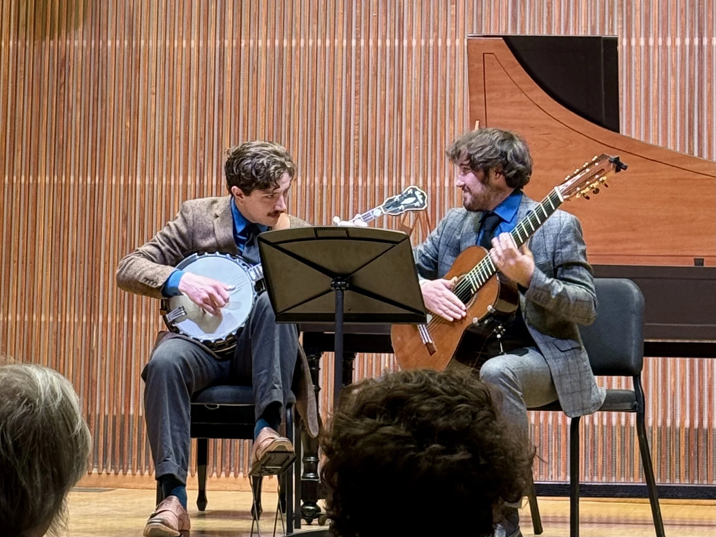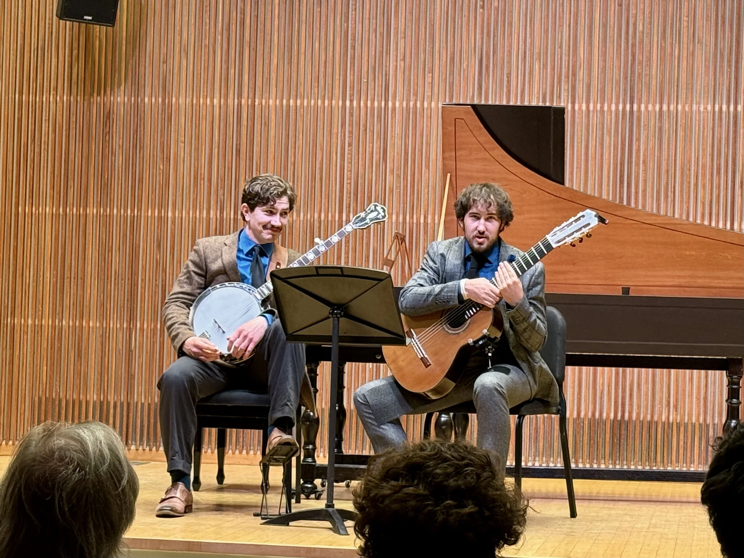 Following this piece was the world-premiere performance of a work for guitar and 5-string banjo, written by recent Oberlin alum, Max Allard. Written for guitar student Solis Dornan (who had taught Max guitar lessons the year prior) and himself to play, the piece, Wreck of the Old Tacoma, was a musical response to the accident which left Solis’ car (his Toyota Tacoma) totaled. It was a very well-written and highly engaging piece. The instruments balanced well and each had ample moments “in the sun” as it unfolded. The audience loved it.