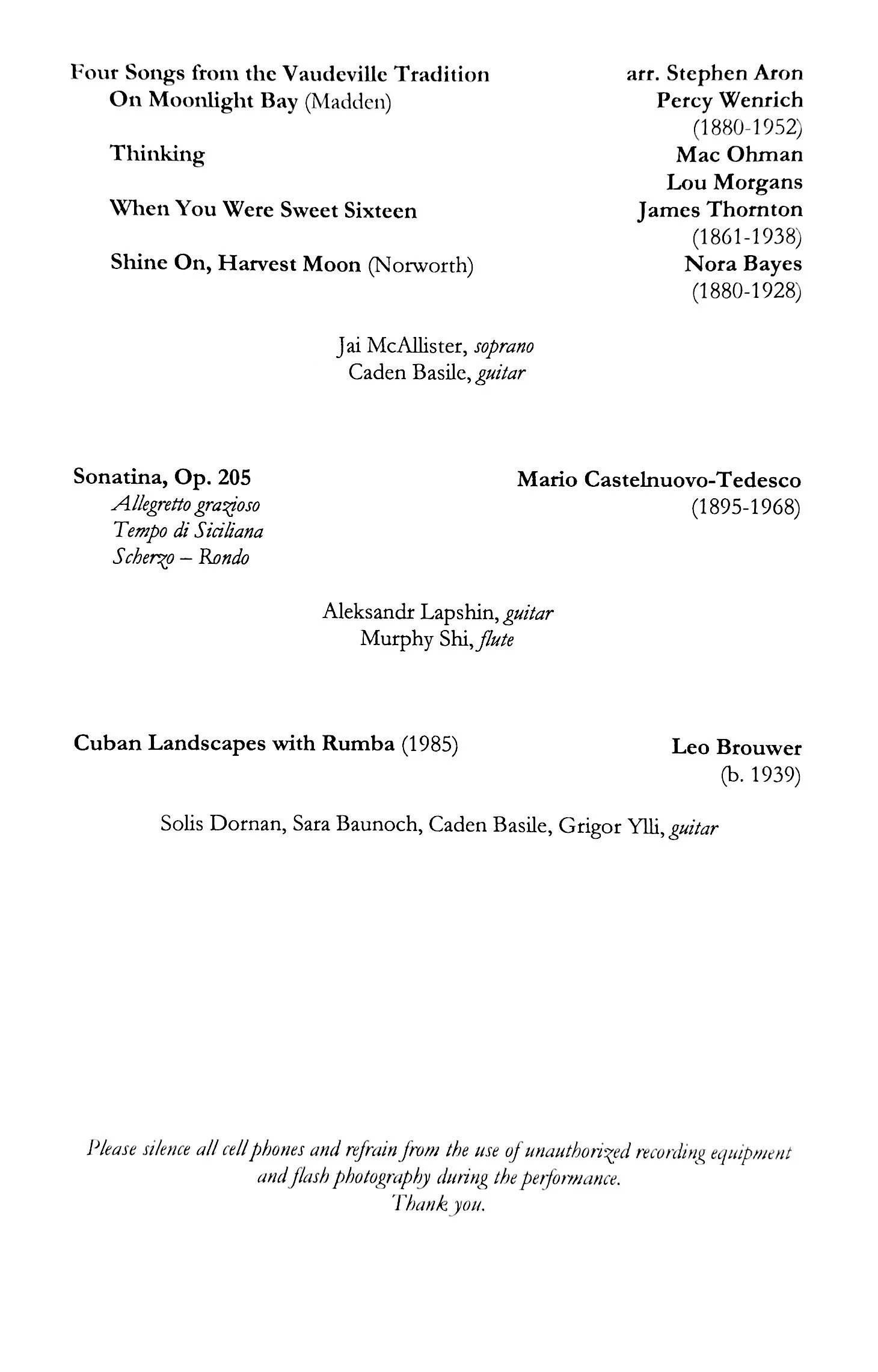 We concluded with a familiar work for guitar quartets, Brouwer’s popular Cuban Landscapes with Rumba. Followers of this blog will know that we don’t always feature music for multiple guitars on our Guitar Ensemble concerts, so it is fun when we do. The students always enjoy playing together like this. (For more on why I favor mixed chamber music, see this post “Why Mixed Chamber Music"?” ). Quartet members Grigor Ylli, Caden Basile, Sara Baunoch and Solis Dornan, really captured the landscape.