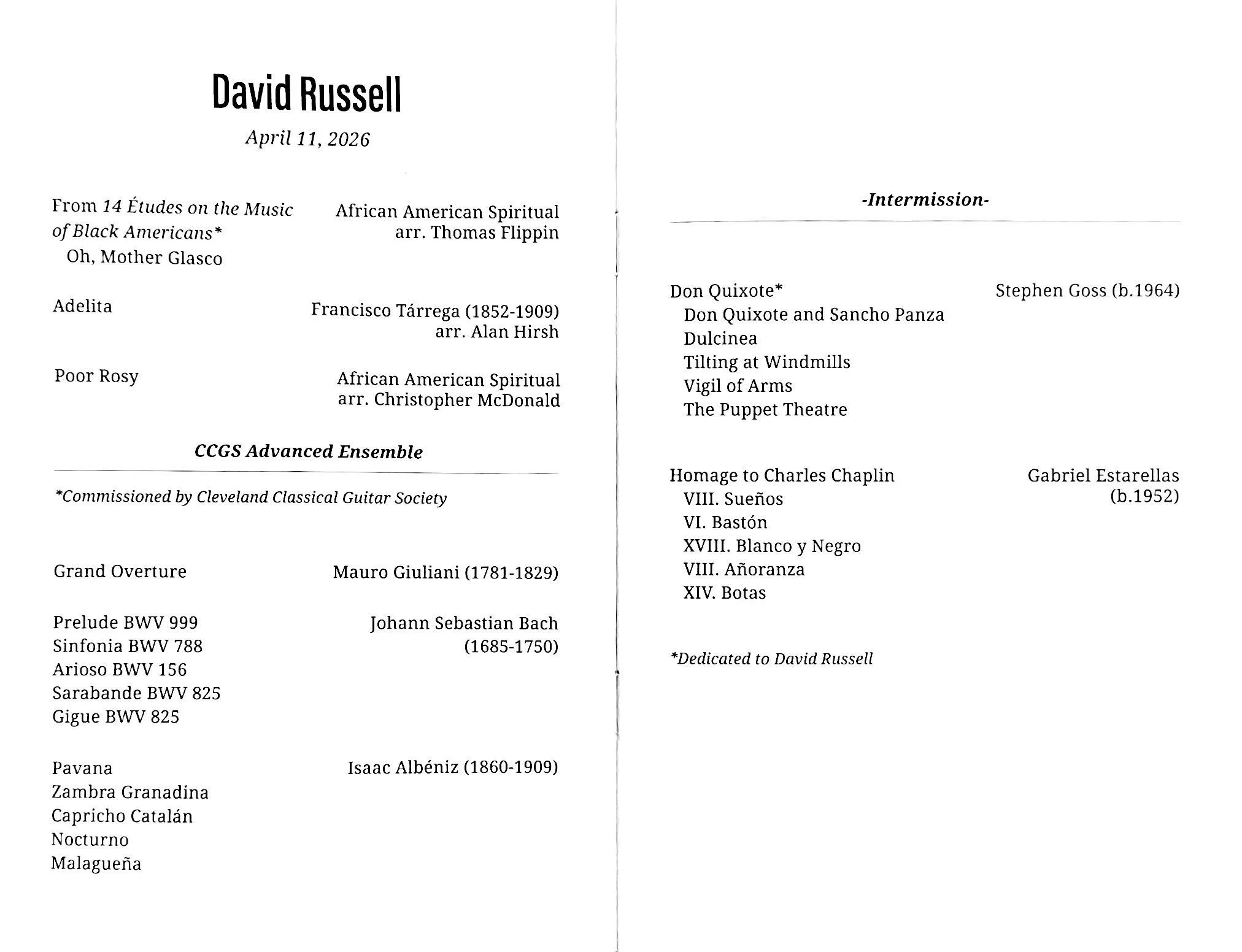 David gave helpful and broad-ranging advice, reinforcing his reputation as the best master class teacher around. Thanks so much to Erik Mann and the staff of CCGS for hosting the artist and making this student opportunity possible! And of course, thanks to David Russell, for continuing to uplift and inspire us all.